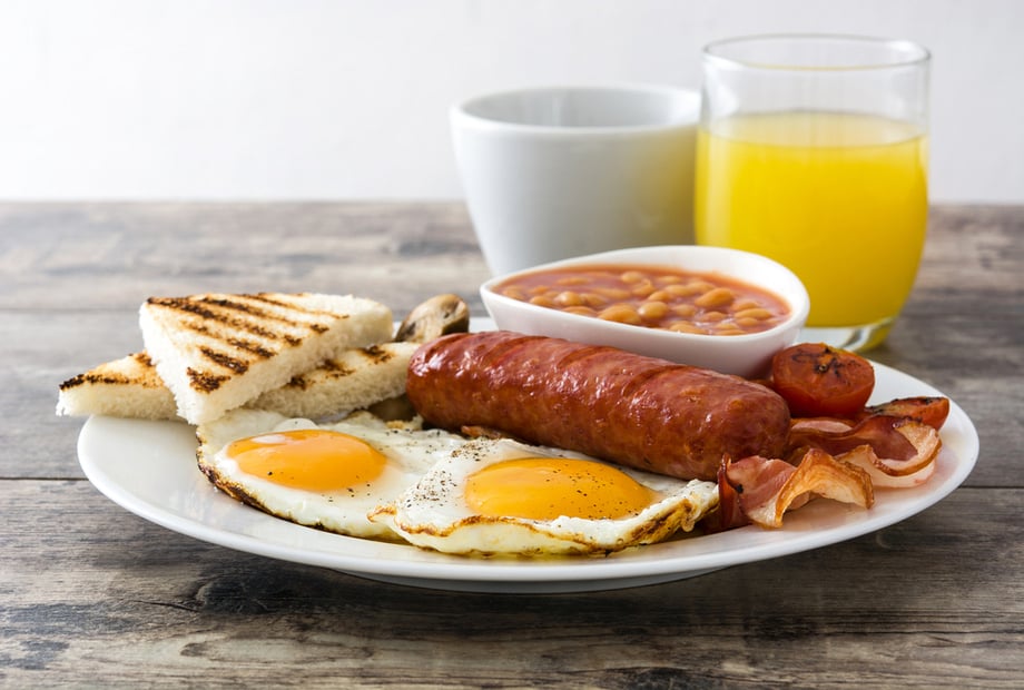 2 fried eggs, 1 rasher of bacon, a pork or beef sausage, fried tomato, baked beans, toast & butter.